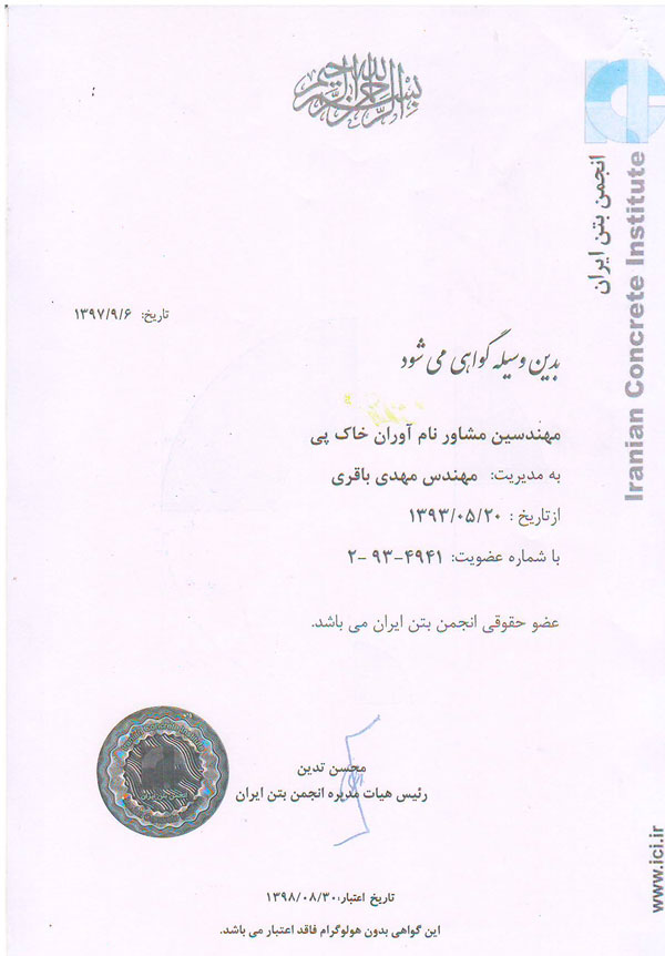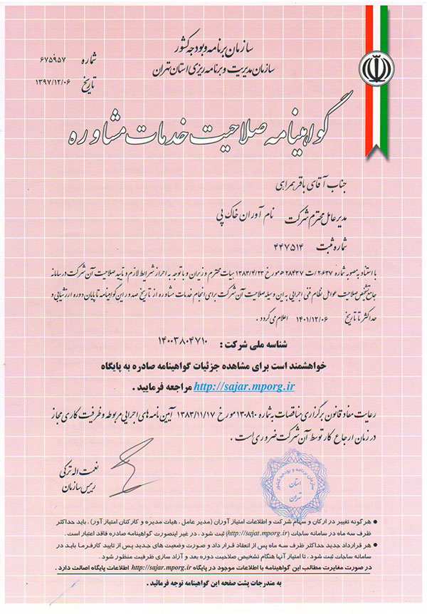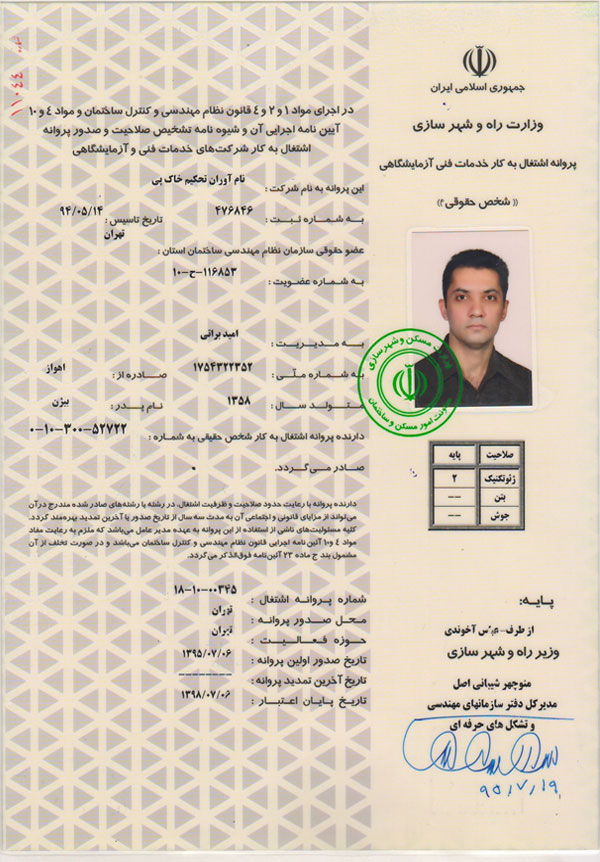 مهندسين مشاور نام آوران خاک پی با شماره ثبت 447514 و دارا بودن گواهینامه صلاحيت خدمات مشاوره در رسته ژئوتکنیک از معاونت برنامه ریزی و نظارت راهبردی ریاست جمهوری و همچنین پروانه اشتغال به کار خدمات فنی آزمایشگاهی از وزارت راه و شهرسازی و كادري مجرب و متخصص ( دكترا در مكانيك خاك و مهندسين با بيش از 25 سال تجربه عملي در آزمايشگاه فني و مكانيك خاك ) افتخار آن را دارد تا در زمینه های زیر جهت هرگونه همکاری با تخفیف ویژه اعلام آمادگی نماید.